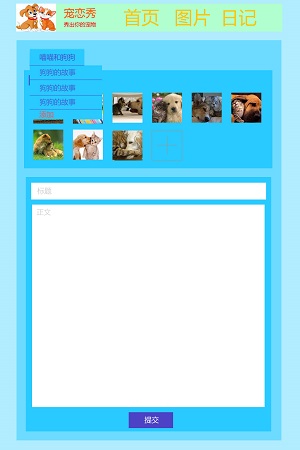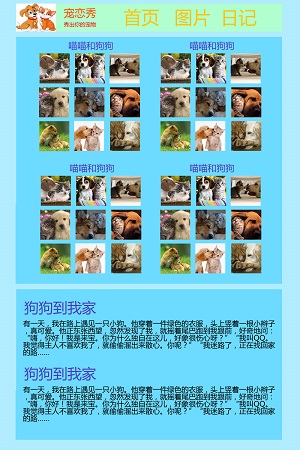 网站风格选用天蓝底色,简约朴实风格,包括以下几个模块,首页,用于概括展示其它模块的最新内容,图片,用来集中展示站主想展示的图片,日记,用来记录站主的一些故事。